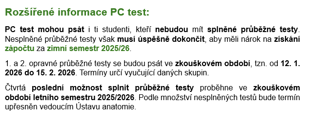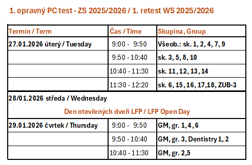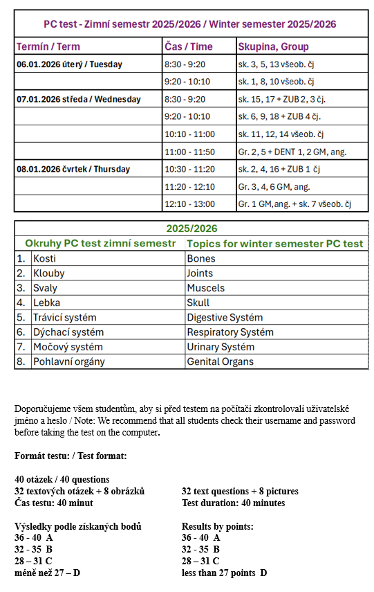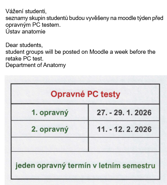 Každé úterý a čtvrtek, počínaje dnem 07.10.2025 (vyjma 14.10., 28.10., 23.12.), si lze v prostorách Ústavu anatomie (1. NP, místnost 1.22) zapůjčit v rámci samostudia originály kostí a model lebky. Výdej je od 16:00 hod. do 16:30 hod., vrácení nejpozději v 18:00 hod. Kosti a modely budou zapůjčeny oproti platnému průkazu ISIC a podepsáním příslušného zápůjčního formuláře. Samostudium bude probíhat pouze v určených prostorách anatomie. Je přísný zákaz fotografování kostí a přísný zákaz odnášení kosti a modelů mimo určené prostory Ústavu anatomie. Uvedené platí do odvolání.